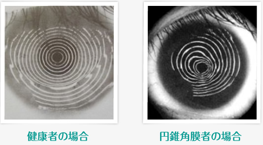 角膜中央付近に円錐状の突出と菲薄化(薄くなること)がみられます。診断不可能な初期病変には角膜形状解析が有用です。角膜形状の変化は、フォトケラトスコープまたは角膜トポグラフィにより診断しますが、現在では角膜トポグラフィによる診断が主流です。